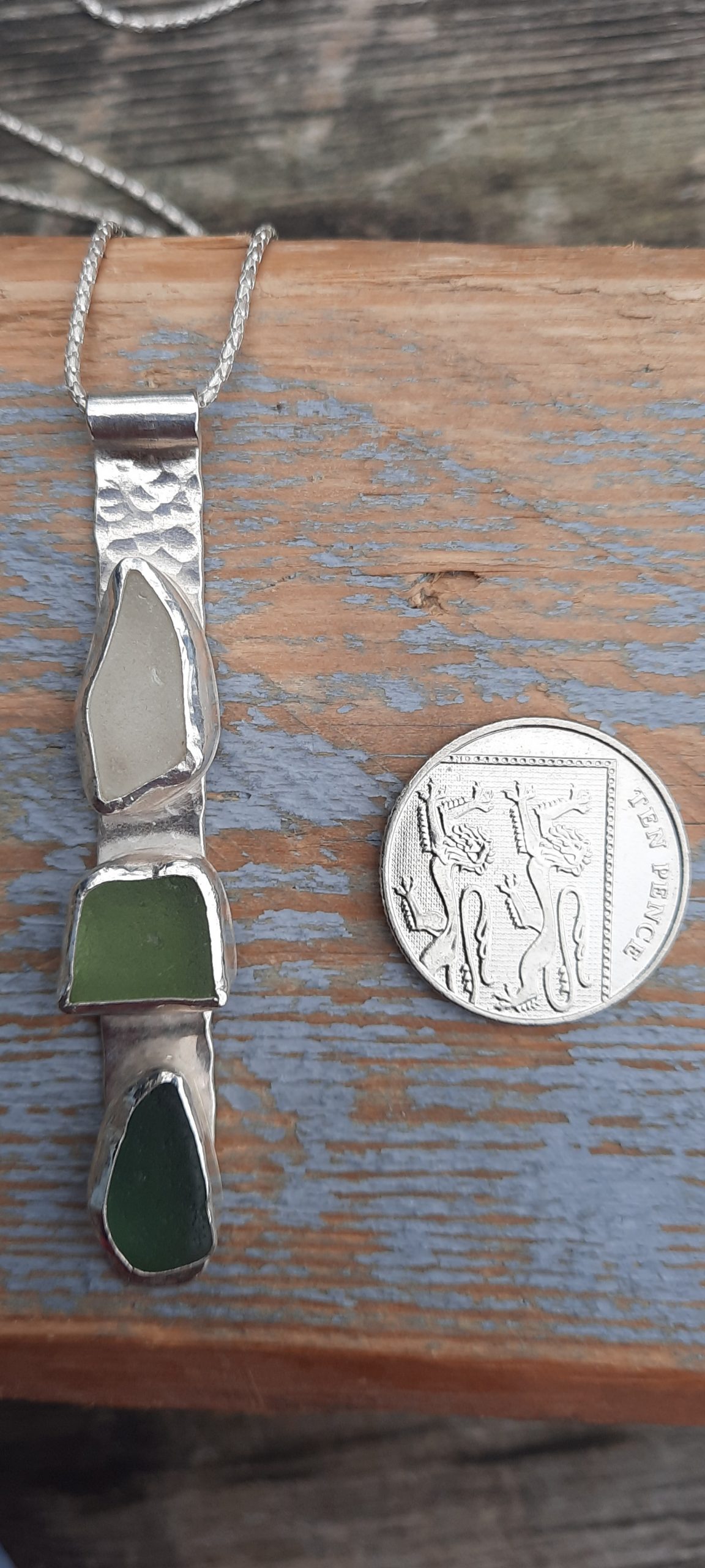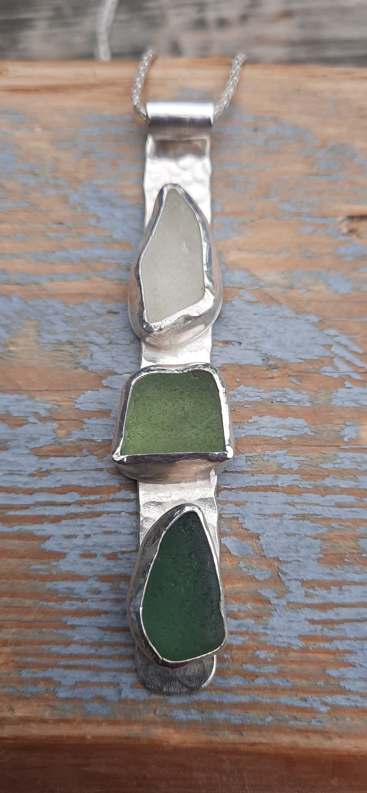 The bezel set cups have been individually handmade for each piece of Seaglass and then soldered to a hand cut strip of recycled, Sterling Silver sheet. The silver base has been hammered to give the impression of dimples as seen in the sand when the tide has gone out. The sterling silver, 18″/45cm chain passes through the wave barrel, that curls over at the top of the pendant, to gently touch the hammered silver beach. Once finished, I send the pendant to be fully Hallmarked by the London Assay Office.