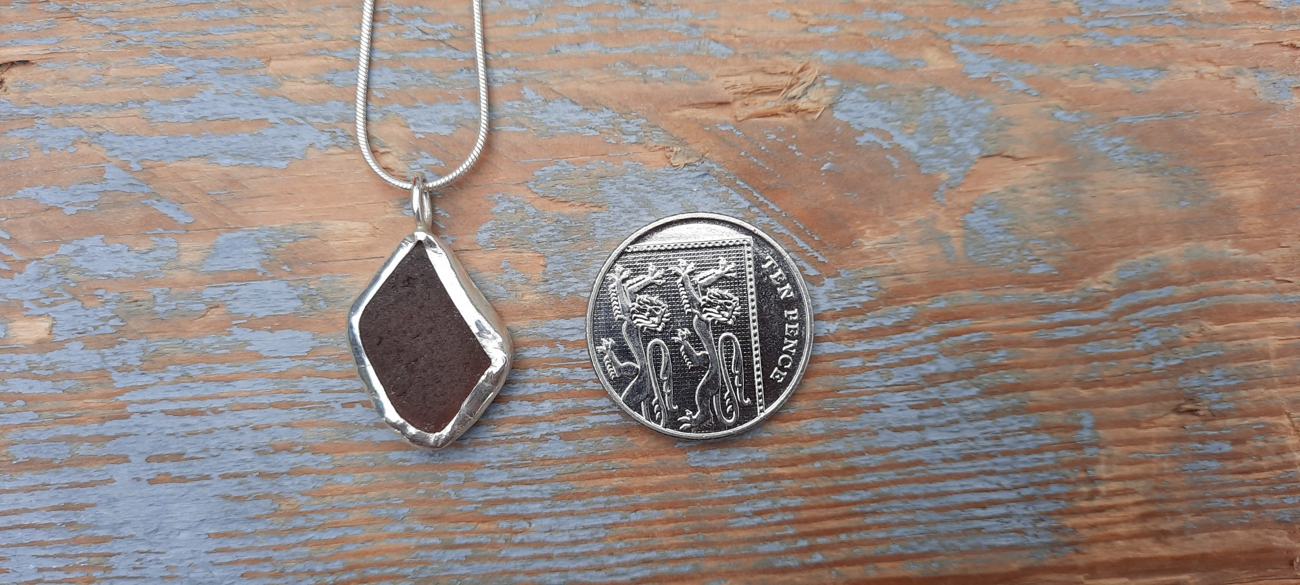 A beautiful nugget of Brown coloured Seaglass, has been encased in recycled sterling silver, to make a bespoke bezel setting, ensuring that no two pendants are ever the same.  Once the bezel cup is finished, I cut the back out of the cup, providing a ledge for the Seaglass to sit on and ensuring the setting is secure.  After finishing making this piece, I send it off to be fully hallmarked by the London Assay Office, making it an unique and special reminder, of Cornish summer days and stunning beaches….