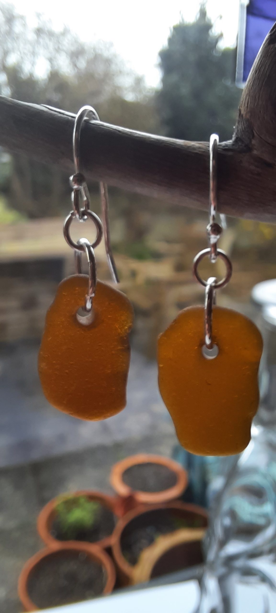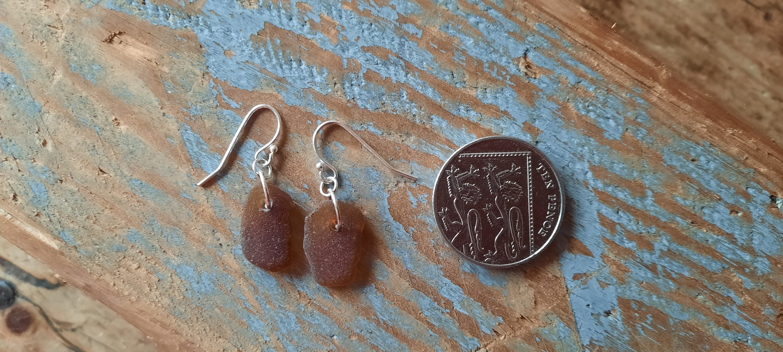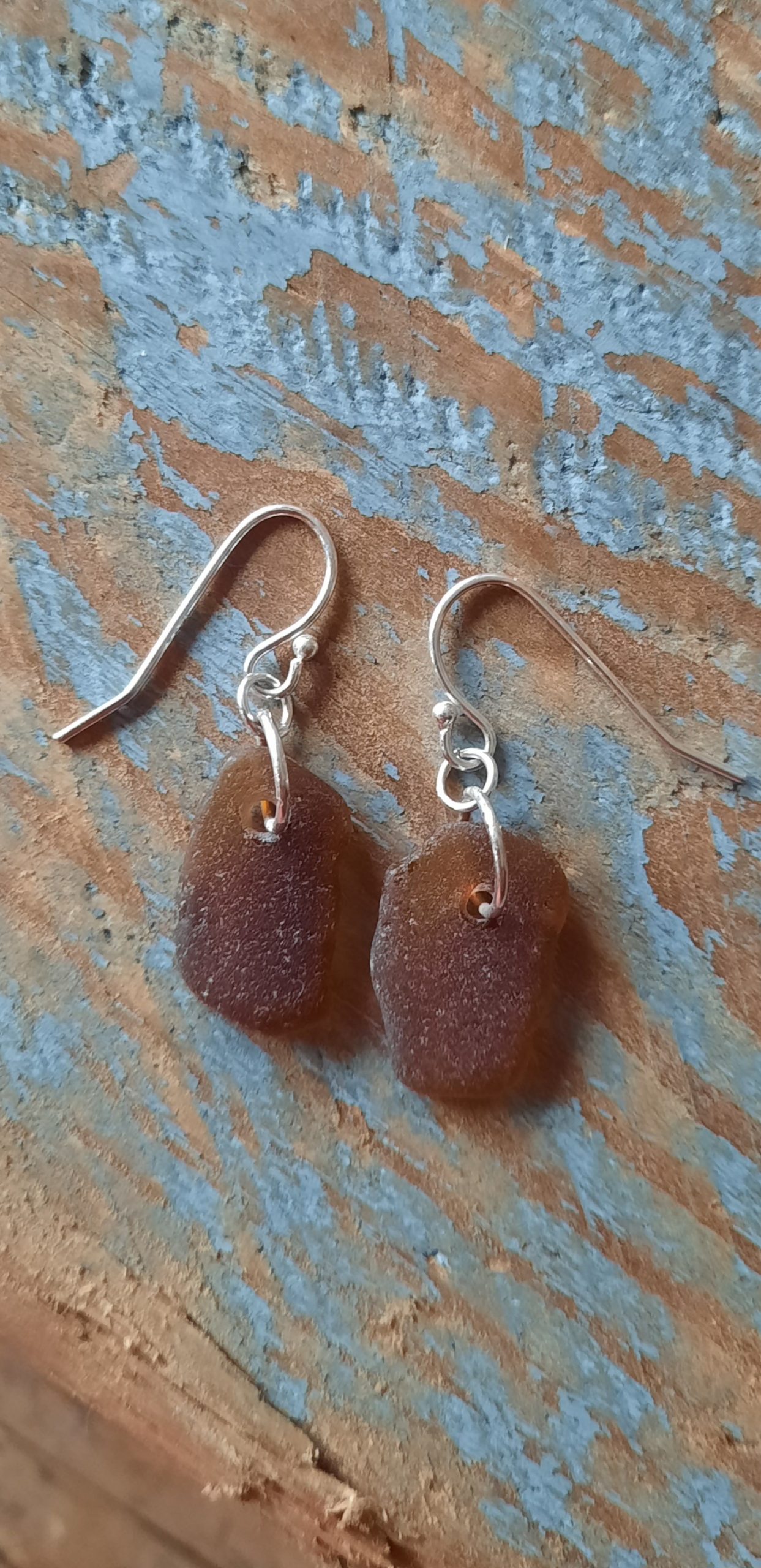 Two well-matched nuggets of Brown Coloured Seaglass, have been carefully drilled and simply made in to a stunning pair of earrings.