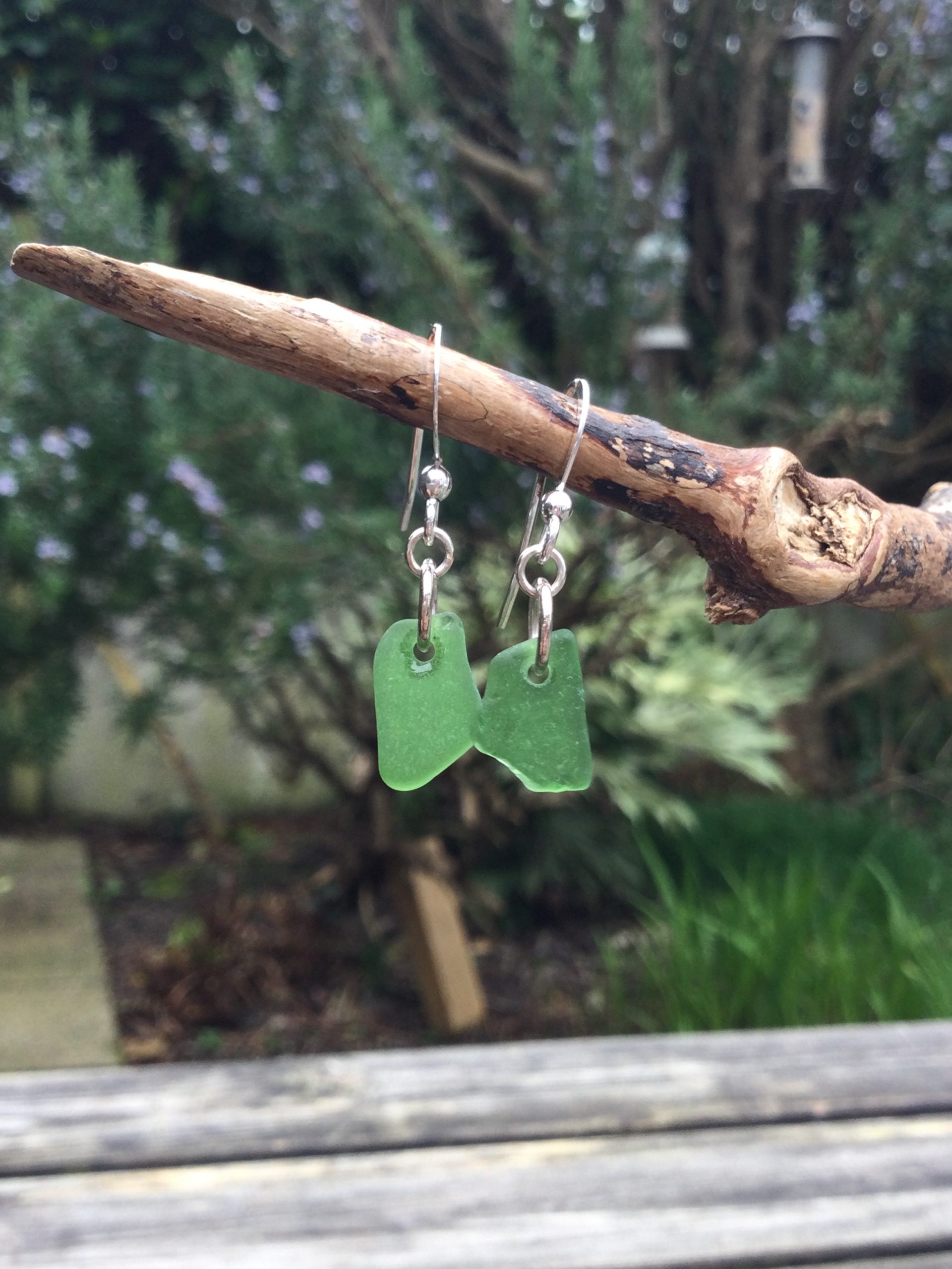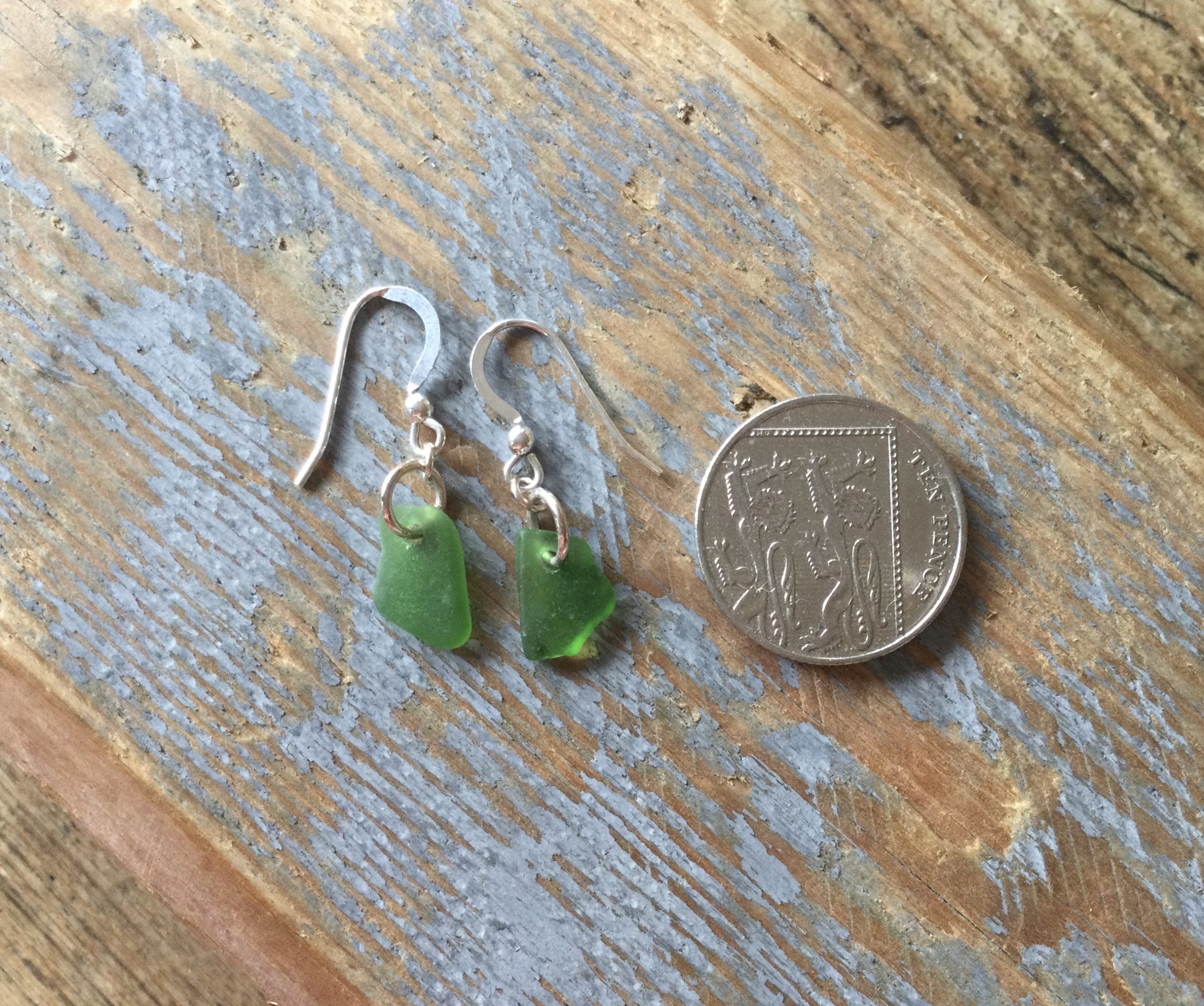 Two well-matched nuggets of Emerald Green Coloured Seaglass, have been carefully drilled and simply made in to a stunning pair of earrings.