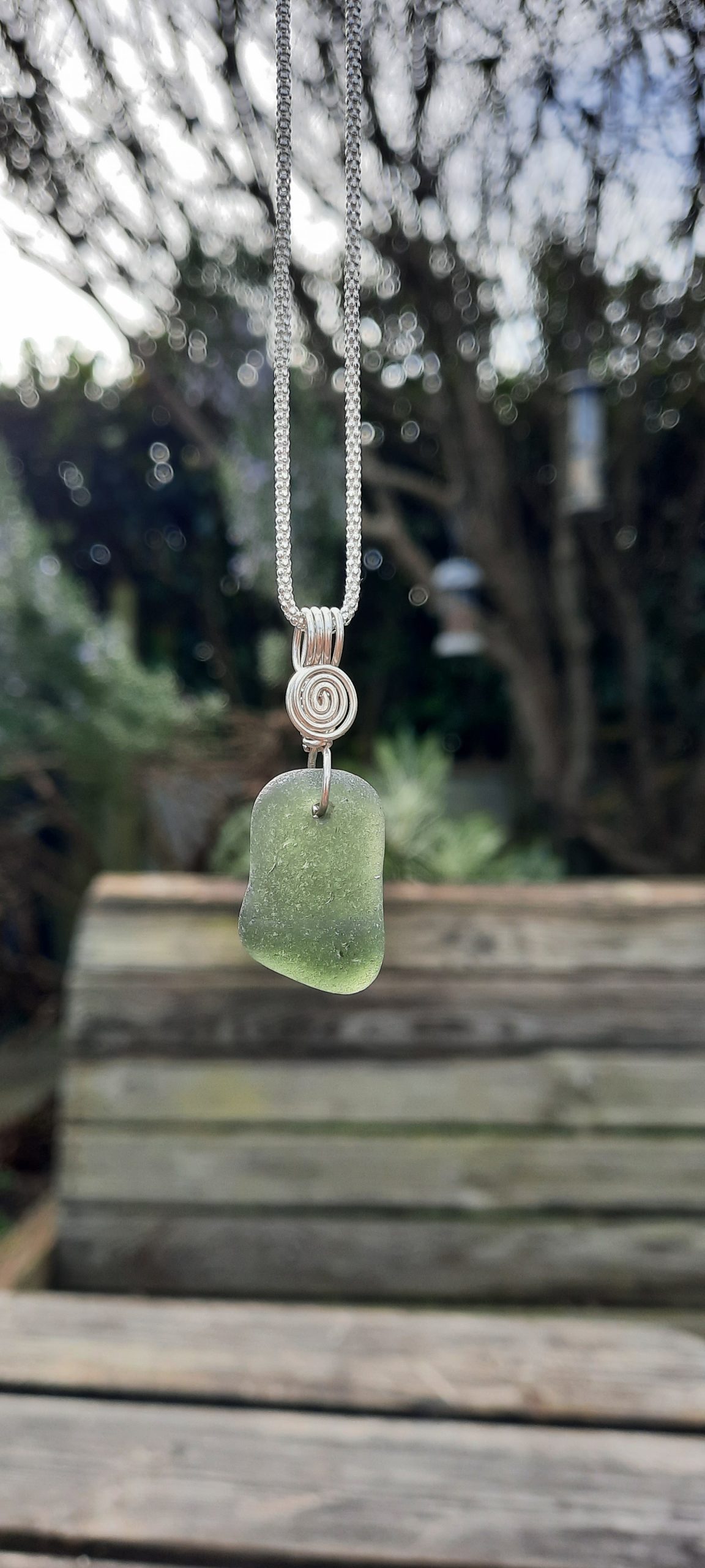 The Sterling Silver wire bail has been securely threaded through the Seaglass and finished off with a spiral, the ancient symbol for energy (always a good thing!), as well as a reminder of the waves that have tumbled it around for decades, and the beautiful, Celtic Cornish beach where it was found…