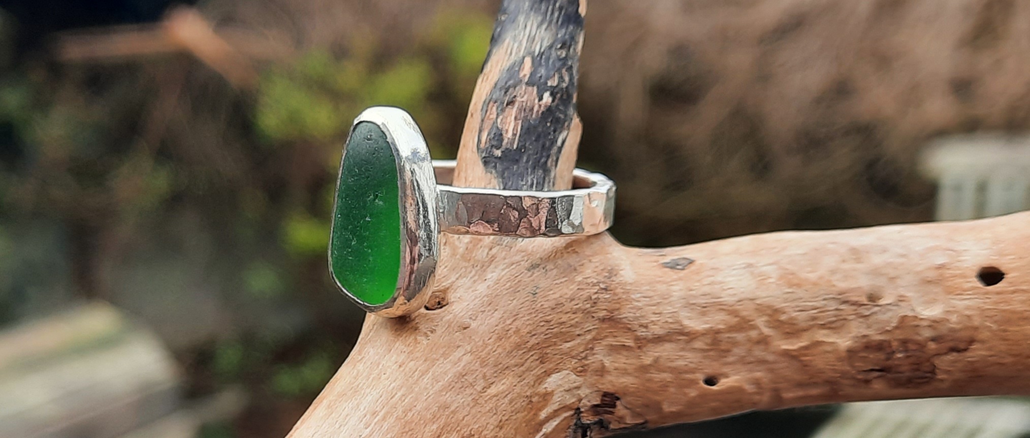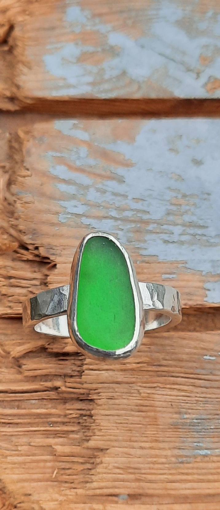 A beautiful nugget of Emerald Green Coloured Seaglass, has been bezel set in sterling silver, to make a stunning ring. The hammered flat band on this ring is 3mm wide.