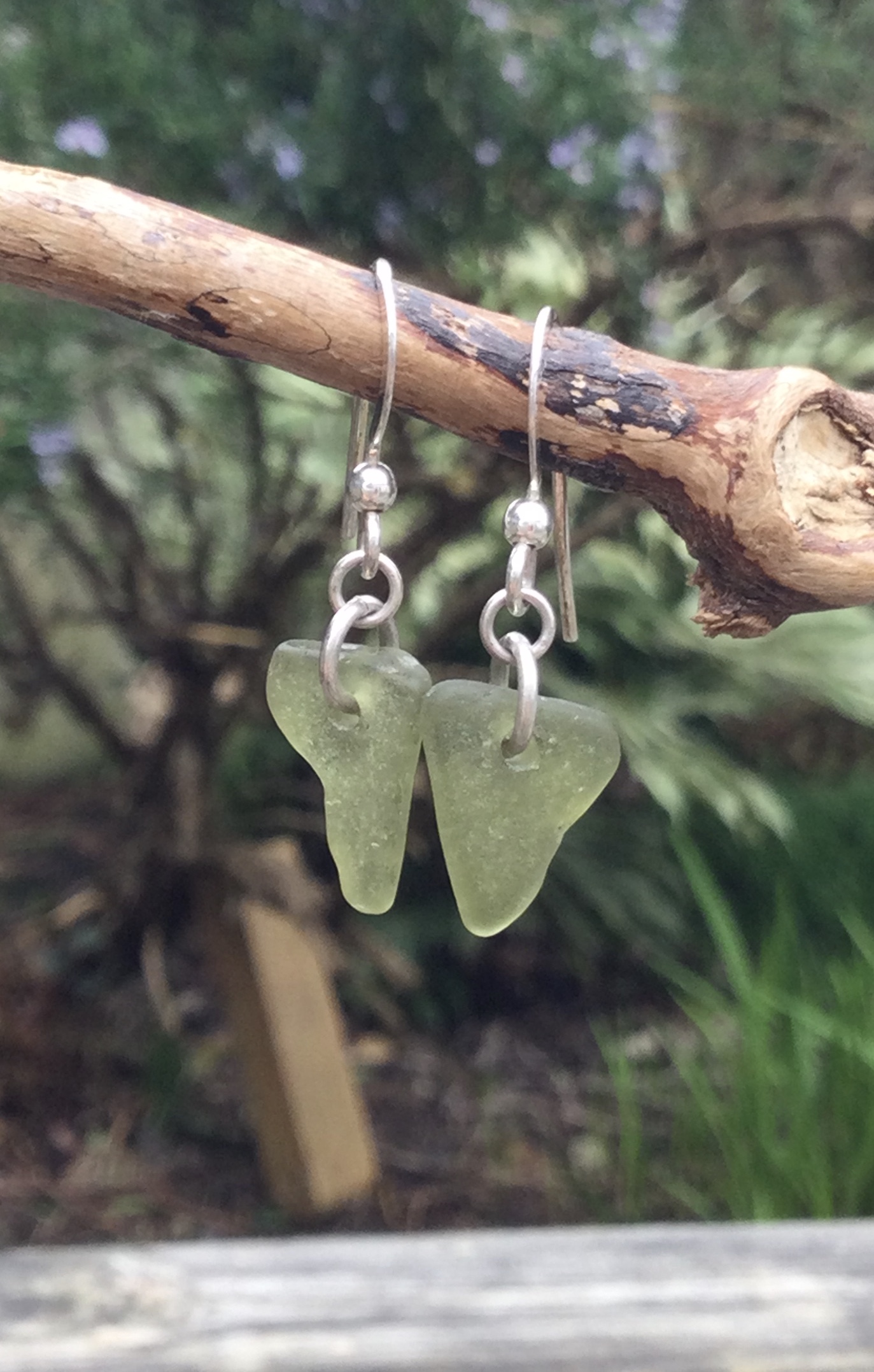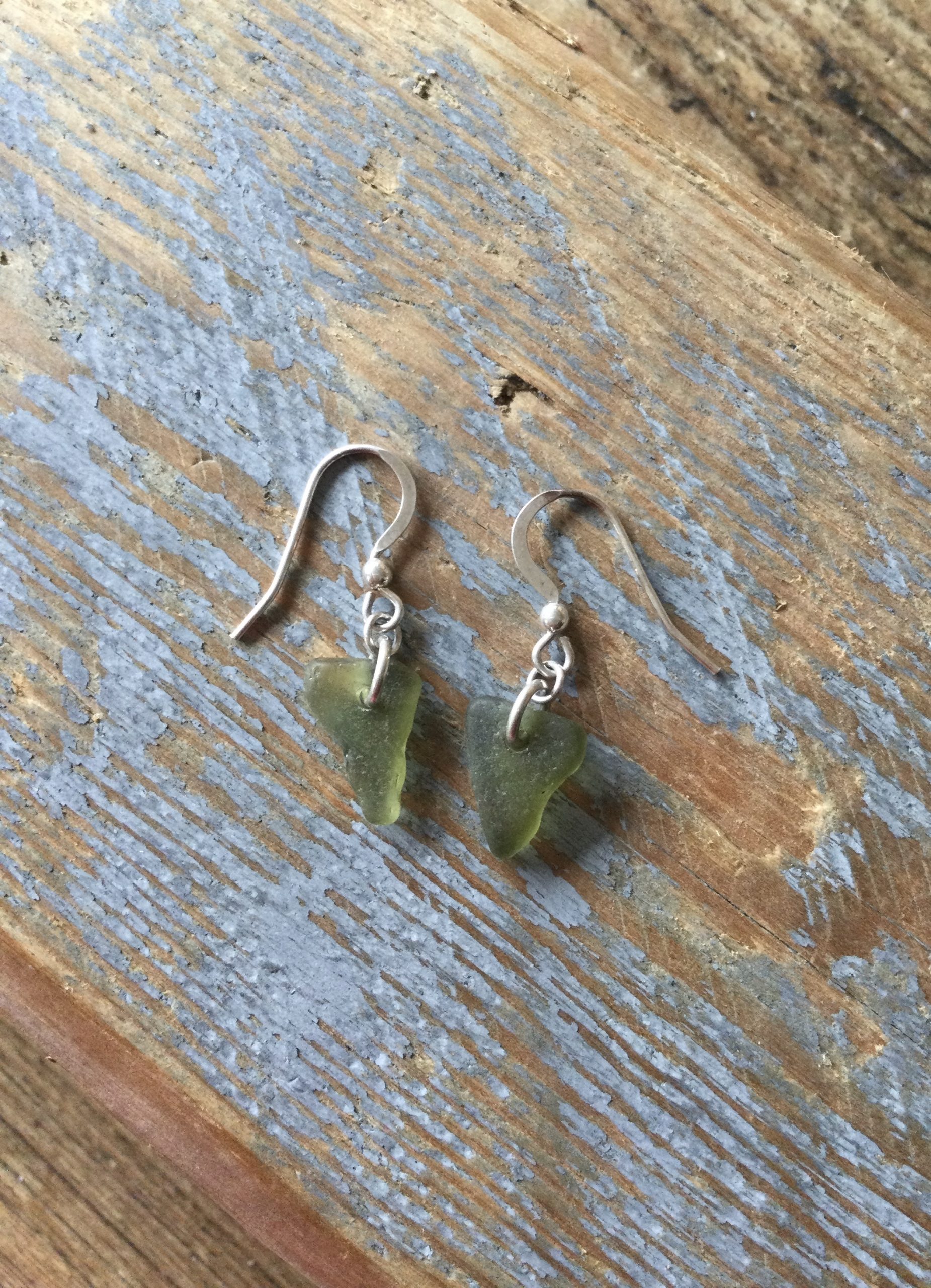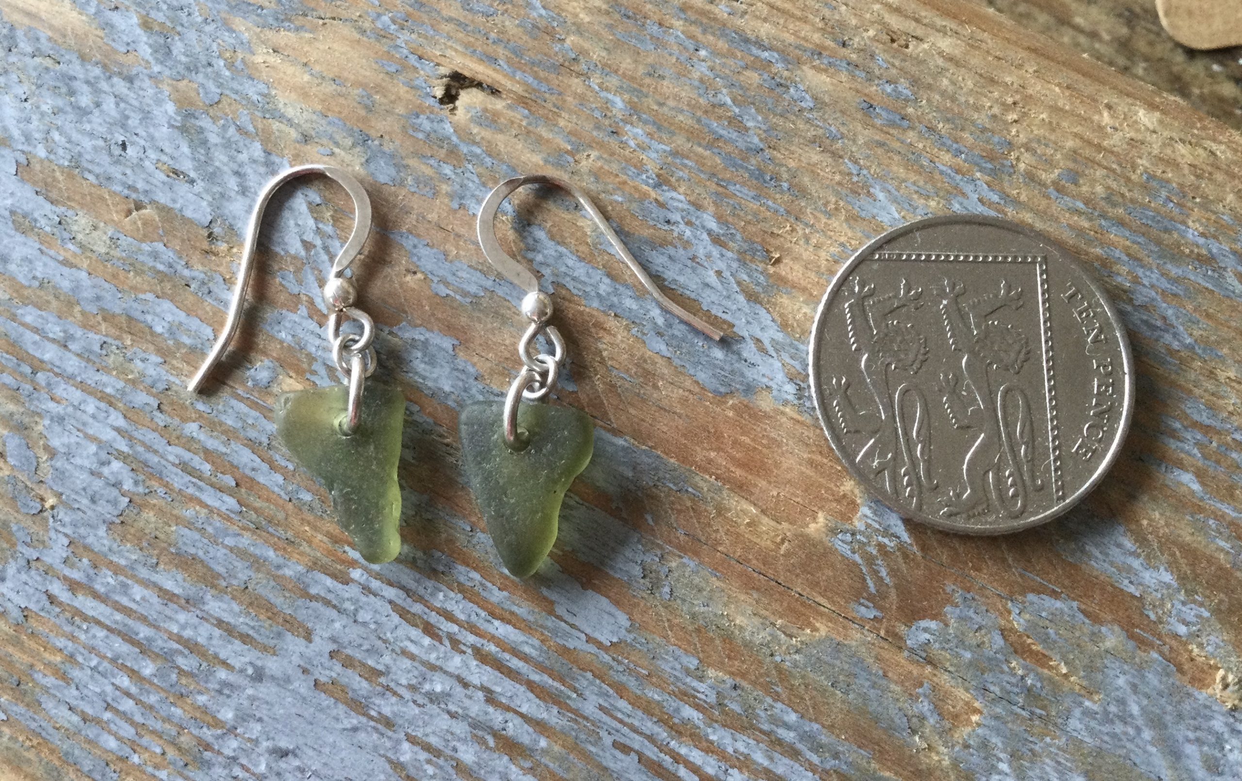 Two well-matched nuggets of Olive Green Coloured Seaglass, have been carefully drilled and simply made in to a stunning pair of earrings.