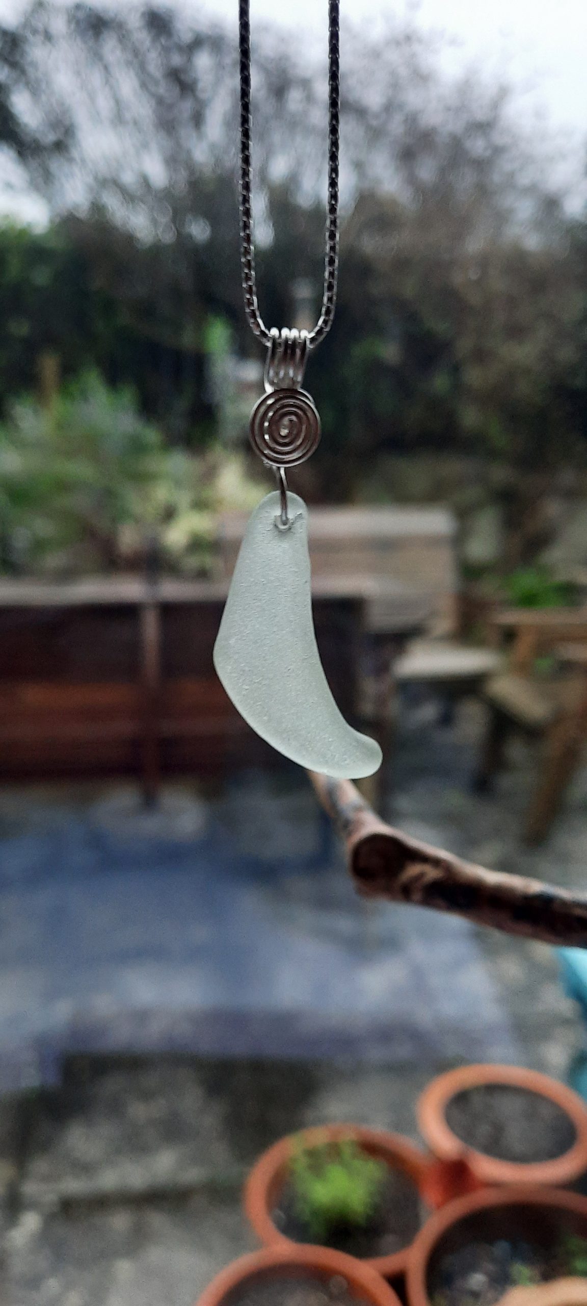 The Sterling Silver wire bail has been securely threaded through the Seaglass and finished off with a spiral, the ancient symbol for energy (always a good thing!), as well as a reminder of the waves that have tumbled it around for decades, and the beautiful, Celtic Cornish beach where it was found…