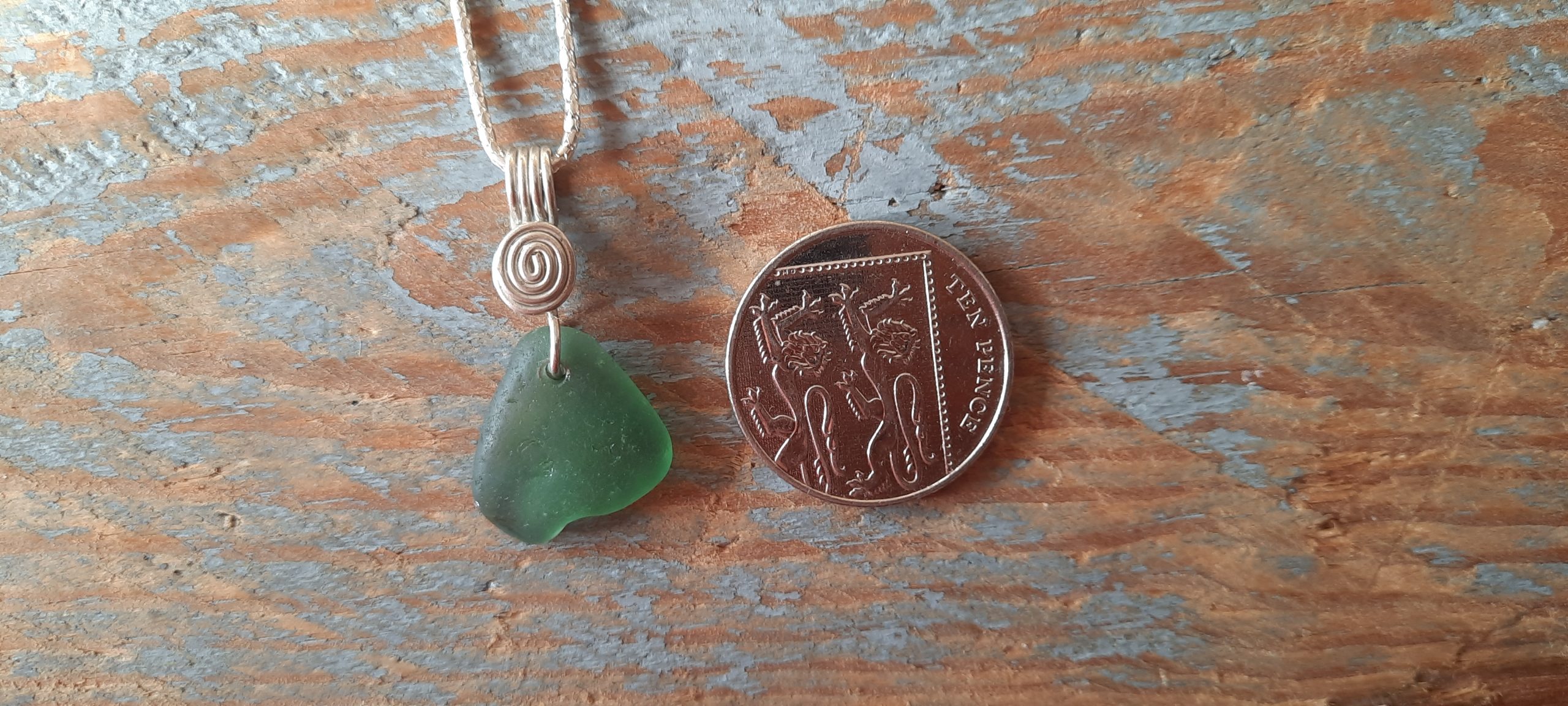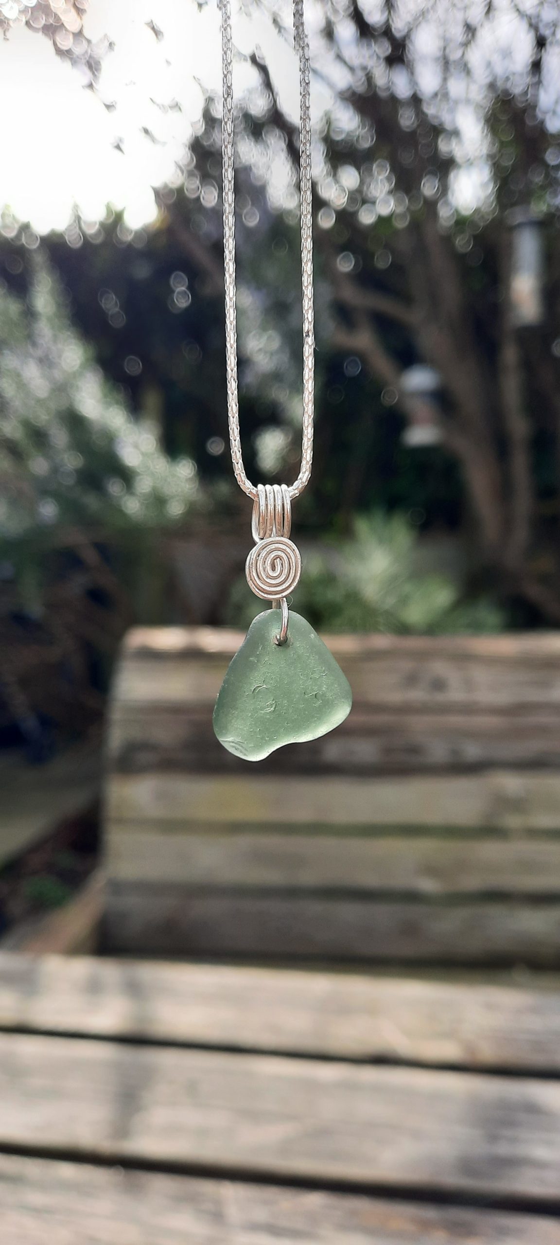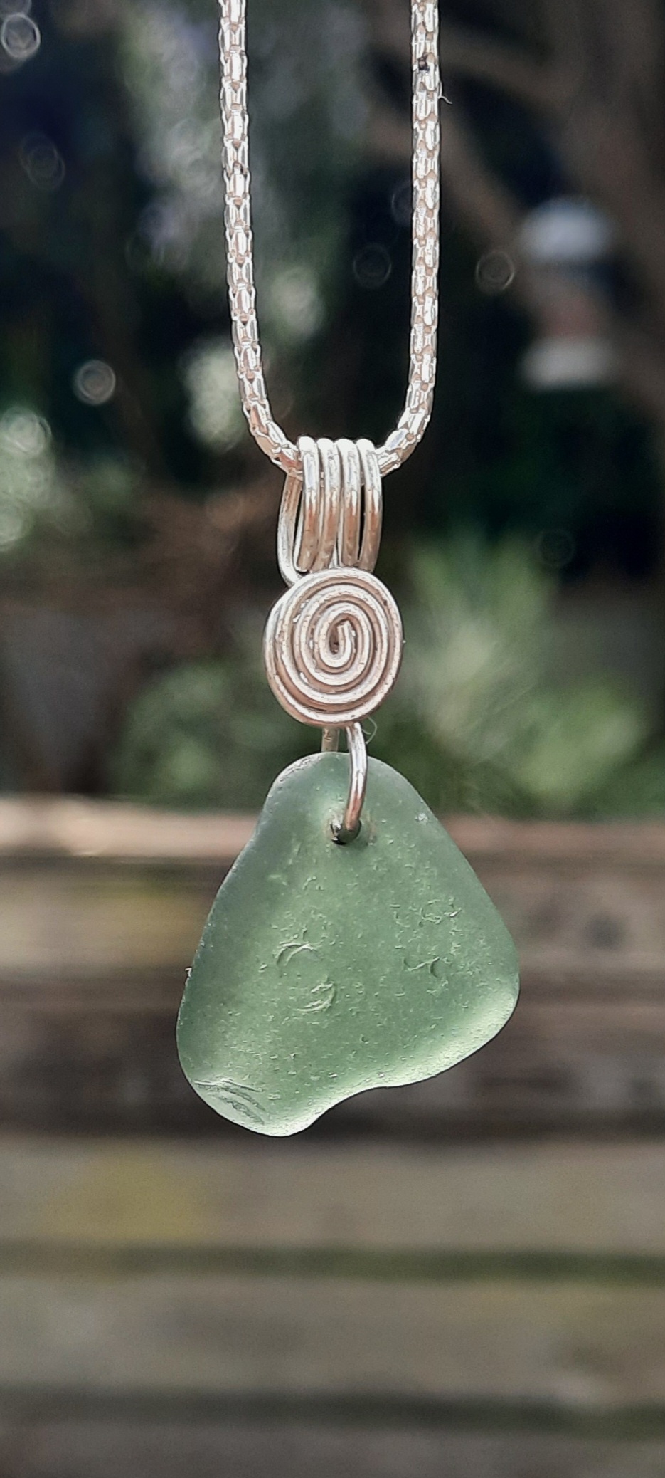 The Sterling Silver wire bail has been securely threaded through the Seaglass and finished off with a spiral, the ancient symbol for energy (always a good thing!), as well as a reminder of the waves that have tumbled it around for decades, and the beautiful, Celtic Cornish beach where it was found…