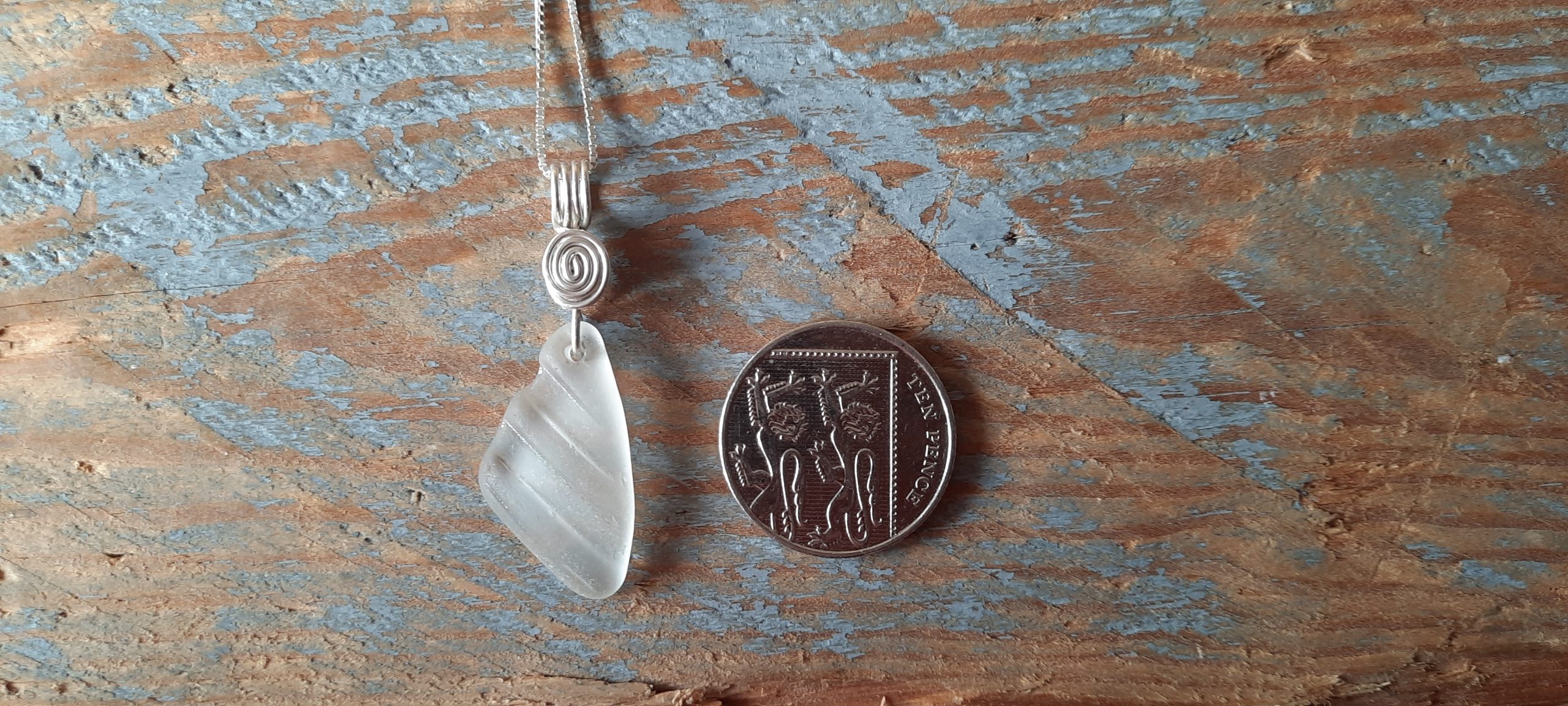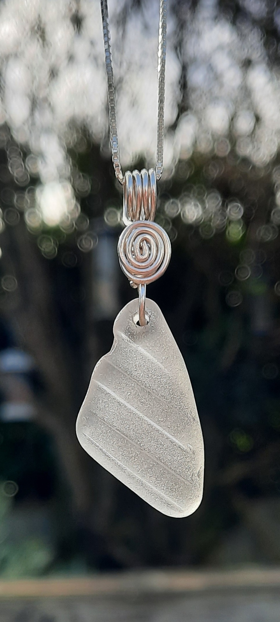 The Sterling Silver wire bail has been securely threaded through the Seaglass and finished off with a spiral, the ancient symbol for energy (always a good thing!), as well as a reminder of the waves that have tumbled it around for decades, and the beautiful, Celtic Cornish beach where it was found…